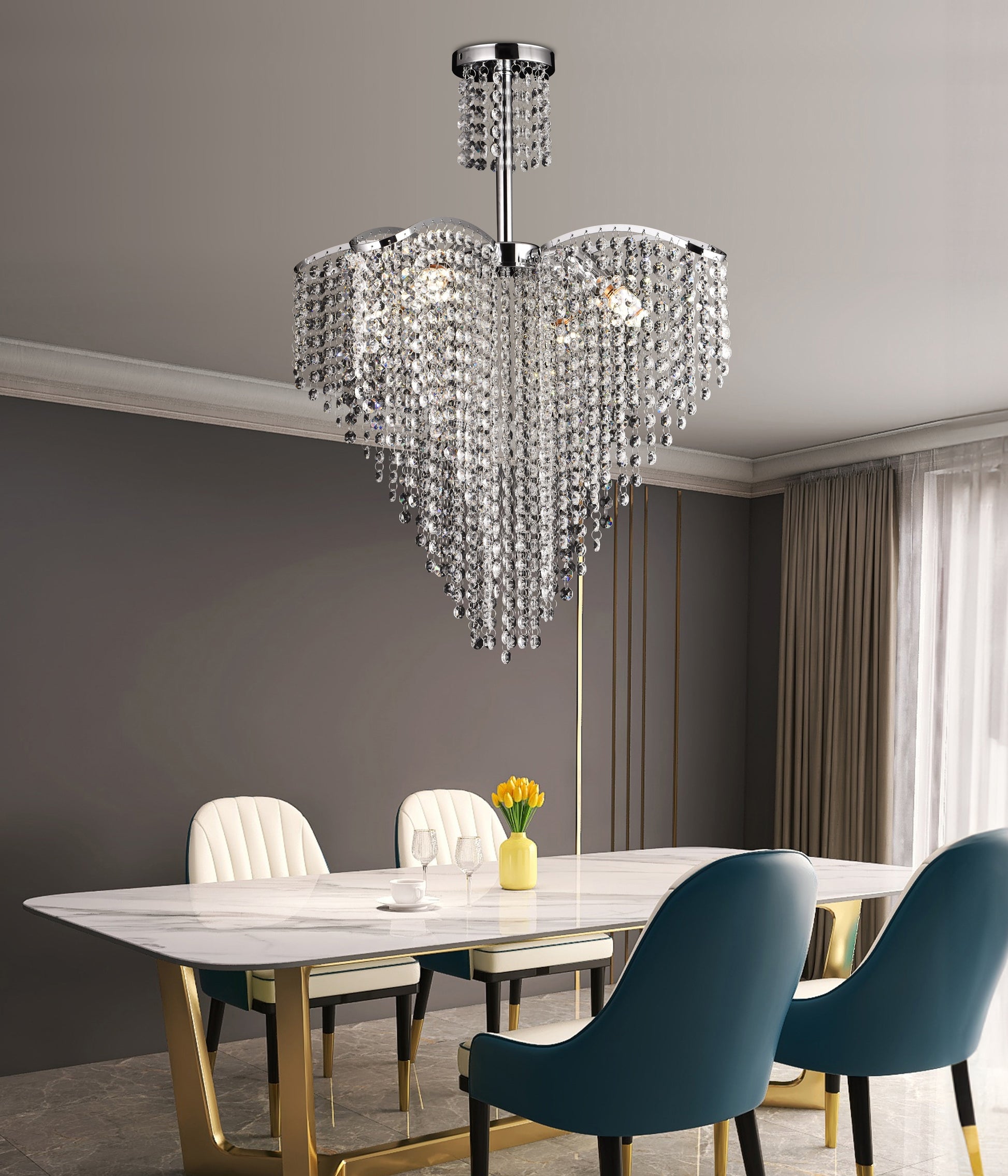 Add elegance to your room with this unique chandelier. The light sources are surrounded by threads adorned with an impressive number of crystals. Once the chandelier is lit, the reflection of light through the carefully positioned crystals creates a unique, aesthetically extraordinary light source.