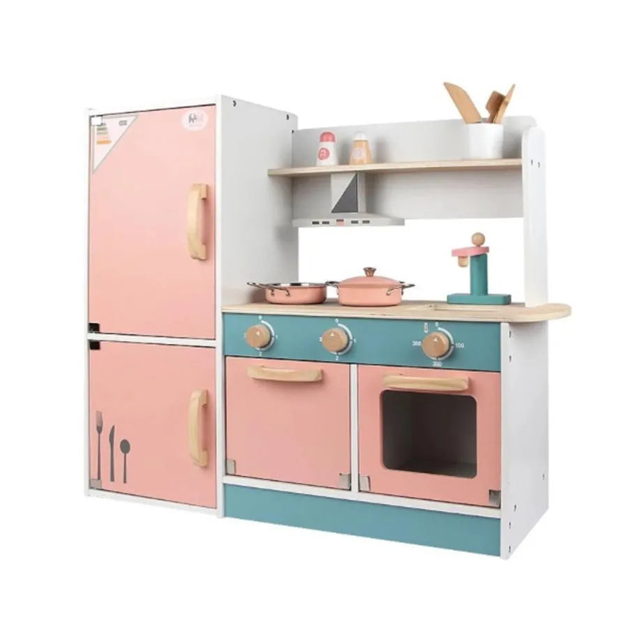 Complete Kitchen Toy with Various Accessories and Refrigerator, 45 Pieces, Turquoise with Pink, Wood