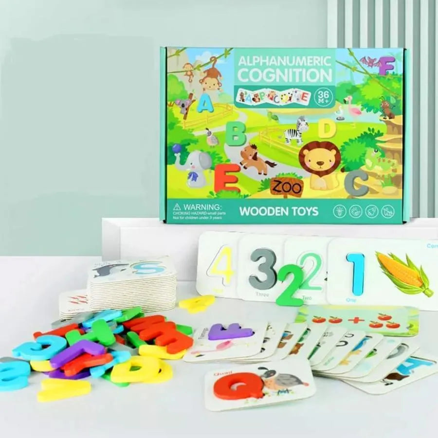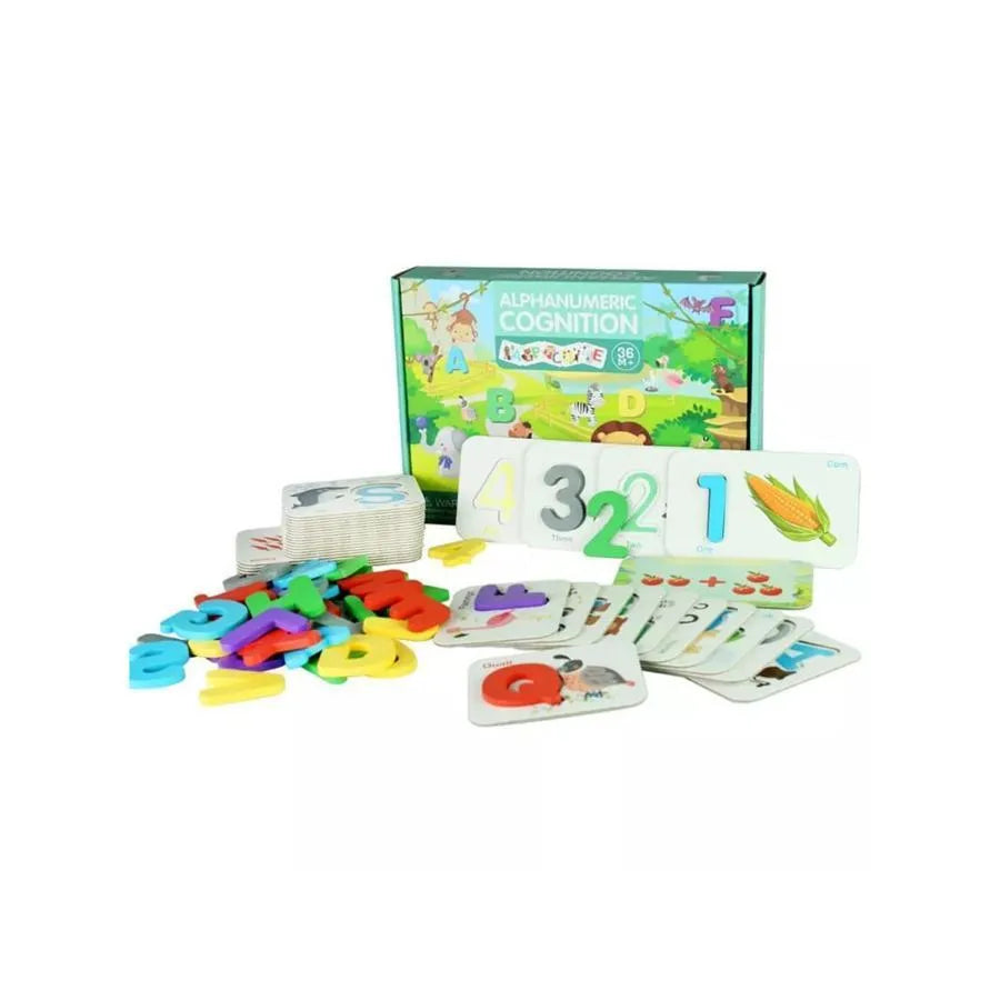 Educational Game Alphabet of Letters and Numbers with Animals, Vegetables and Fruits, Wood and Cardboard