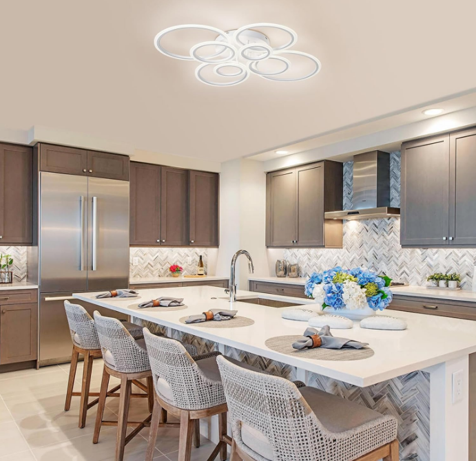 Each circle integrates high quality LED strips, which distributes the light evenly and comfortably, without dark areas. With a total power of 130W and an impressive luminous flux of 10,400 lm, BETTY is ideal for spacious living rooms, large bedrooms, offices or open-space areas.