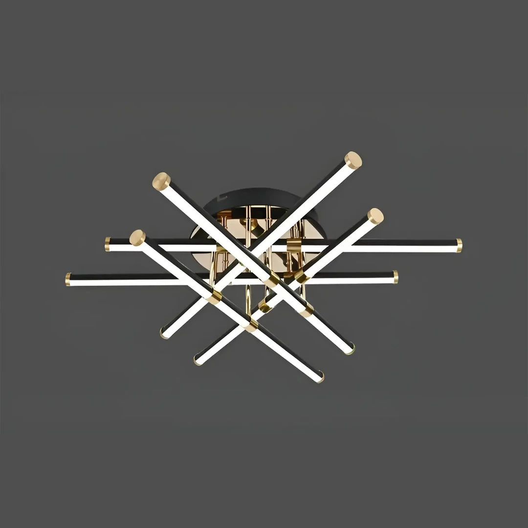 The six elements, the shape of which is not specified, are illuminated by LEDs with the possibility of selecting the color temperature. Via the remote control, you can choose between cold, warm or neutral light, and you can adjust the intensity of the light thanks to the dimming function. The combination of black and shiny gold adds a sophisticated contrast and a touch of luxury to the design. With a power of 144W, it is ideal for lighting large living rooms, dining rooms or other large spaces.