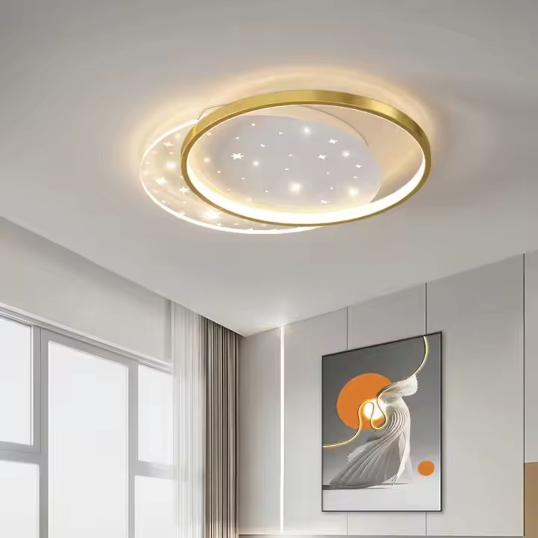 With a modern circular design and a warm gold finish, LUNAR brings an extra touch of sophistication and balanced light to any room. The two interconnected circles provide an airy visual effect, ideal for elegant or contemporary spaces.