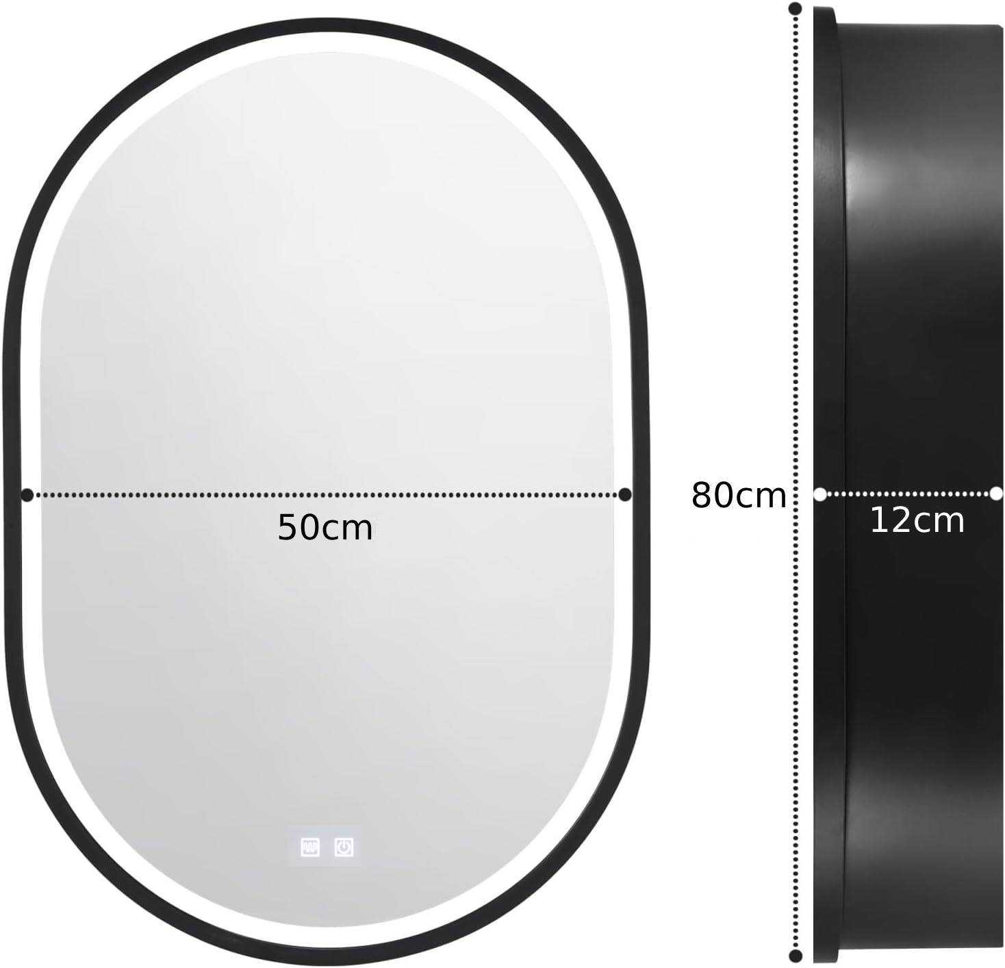 LED Mirror with Cabinet, Oval, 50x80cm, Demist, Cold/Warm/Neutral Light, Black Frame, Storage Space