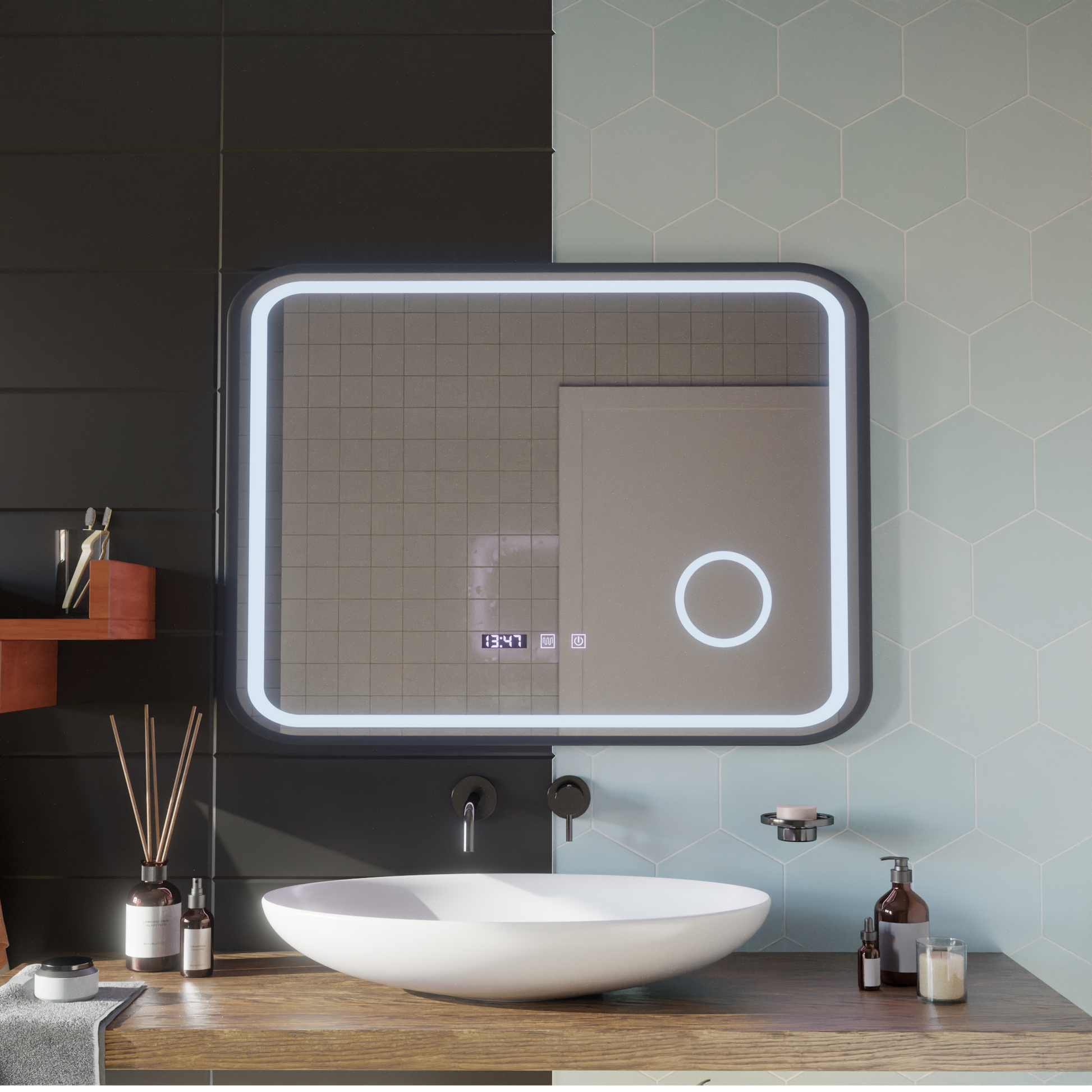 Bernd Touch LED Mirror Defog System, Clock and Temperature 80x60 cm Brushed Black Frame Cosmetic Magnifier