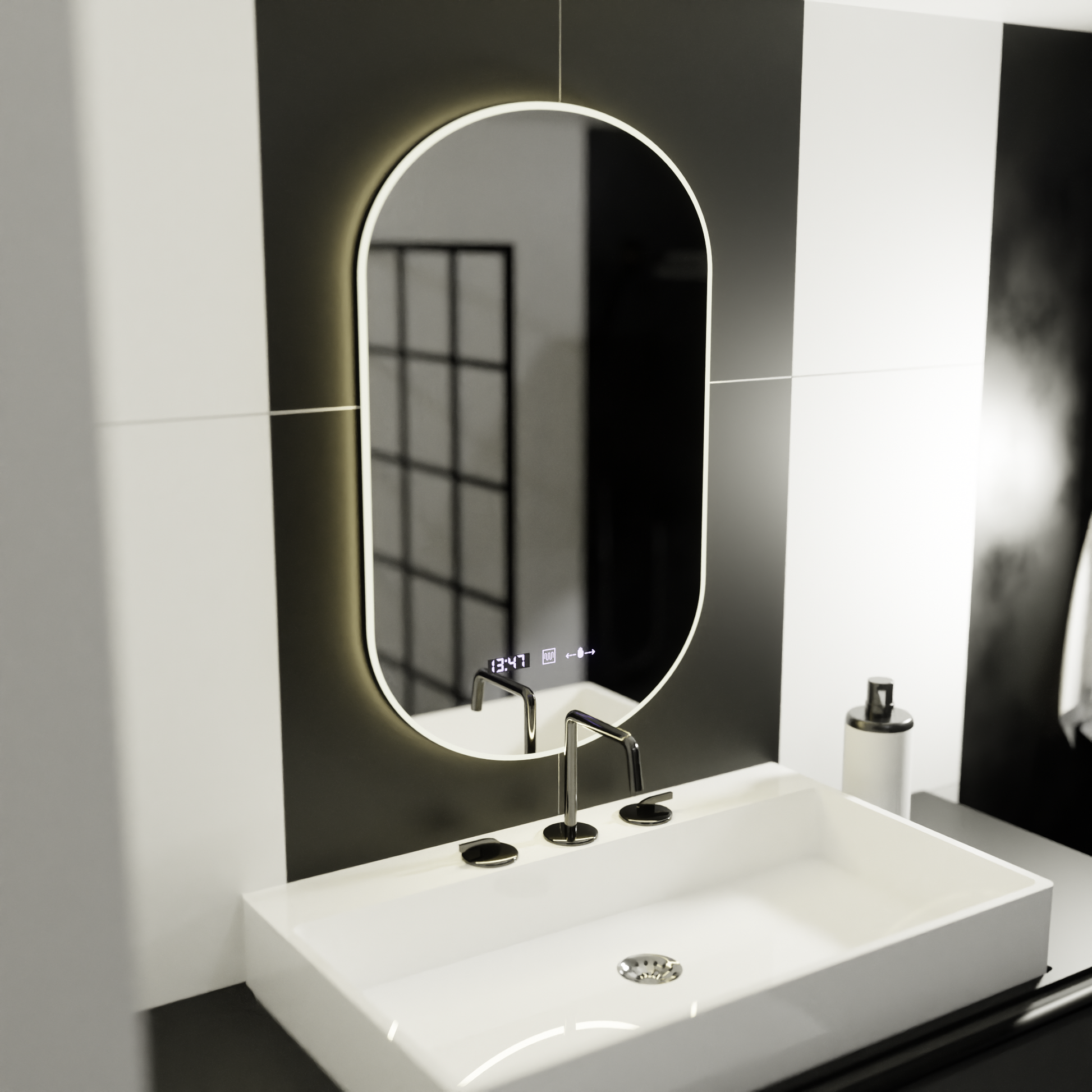 Oval LED mirror 50x80 cm LUCIA – Marcello impresses with its fluid lines and discreetly integrated technology. Equipped with an activation sensor, dimmable LED lighting and smart functions such as demisting, clock and digital thermometer, LUCIA is the perfect choice for a modern, functional and refined space.
