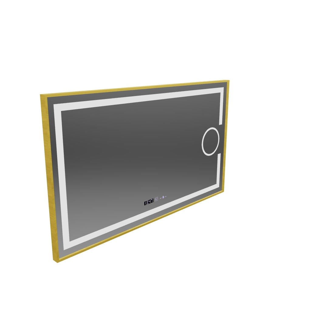 Rectangular LED mirror, 110x65cm, Eclat MotionGlow Marcello, Demister System, Clock & Thermometer, Cosmetic Magnifier, Dimable, Brushed Gold Frame