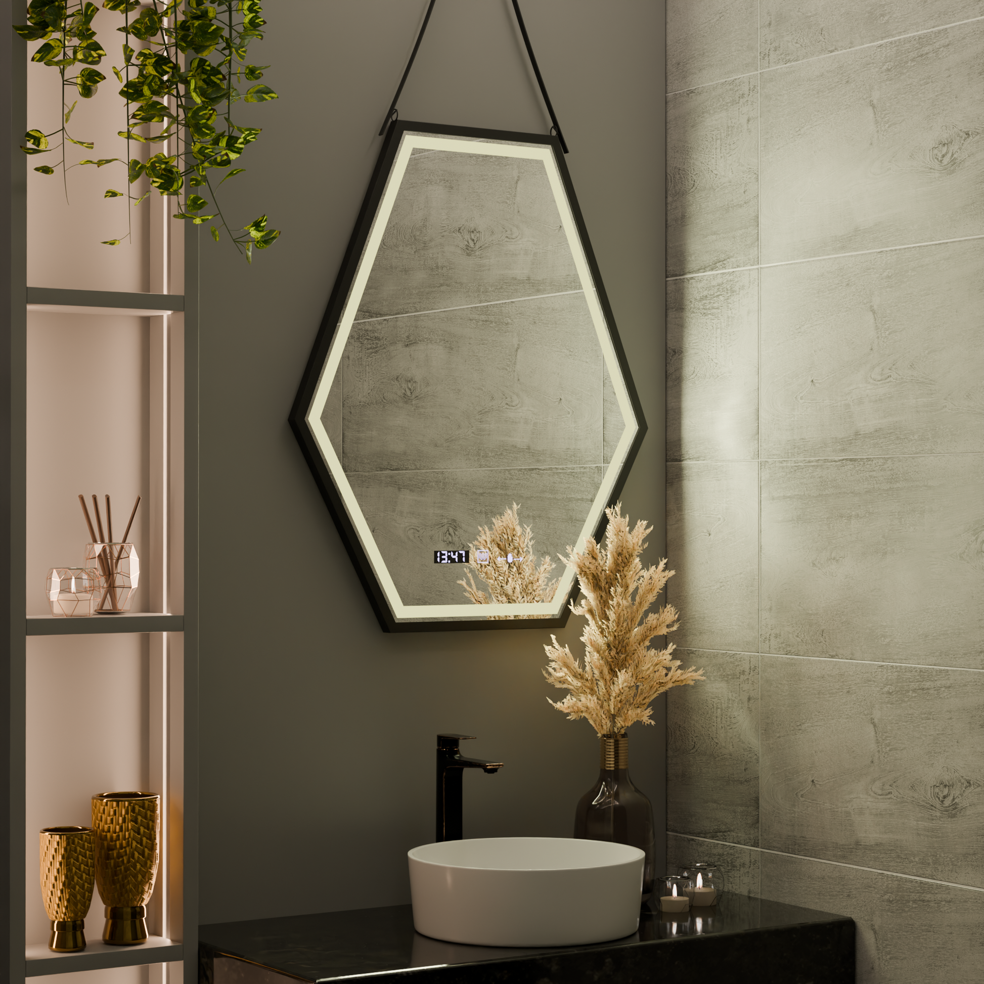 Rectangular LED mirror 120x80 cm - Motionglow Marcello It brings to the forefront the advanced functionality in a generous and elegant format. Dimable LED lighting, proximity sensor activation and intelligent functions-disabilities, clock, thermometer and integrated cosmetic magnifying-transform the mirror into a trusted ally for the daily routine. Perfect for spacious baths or private spas.