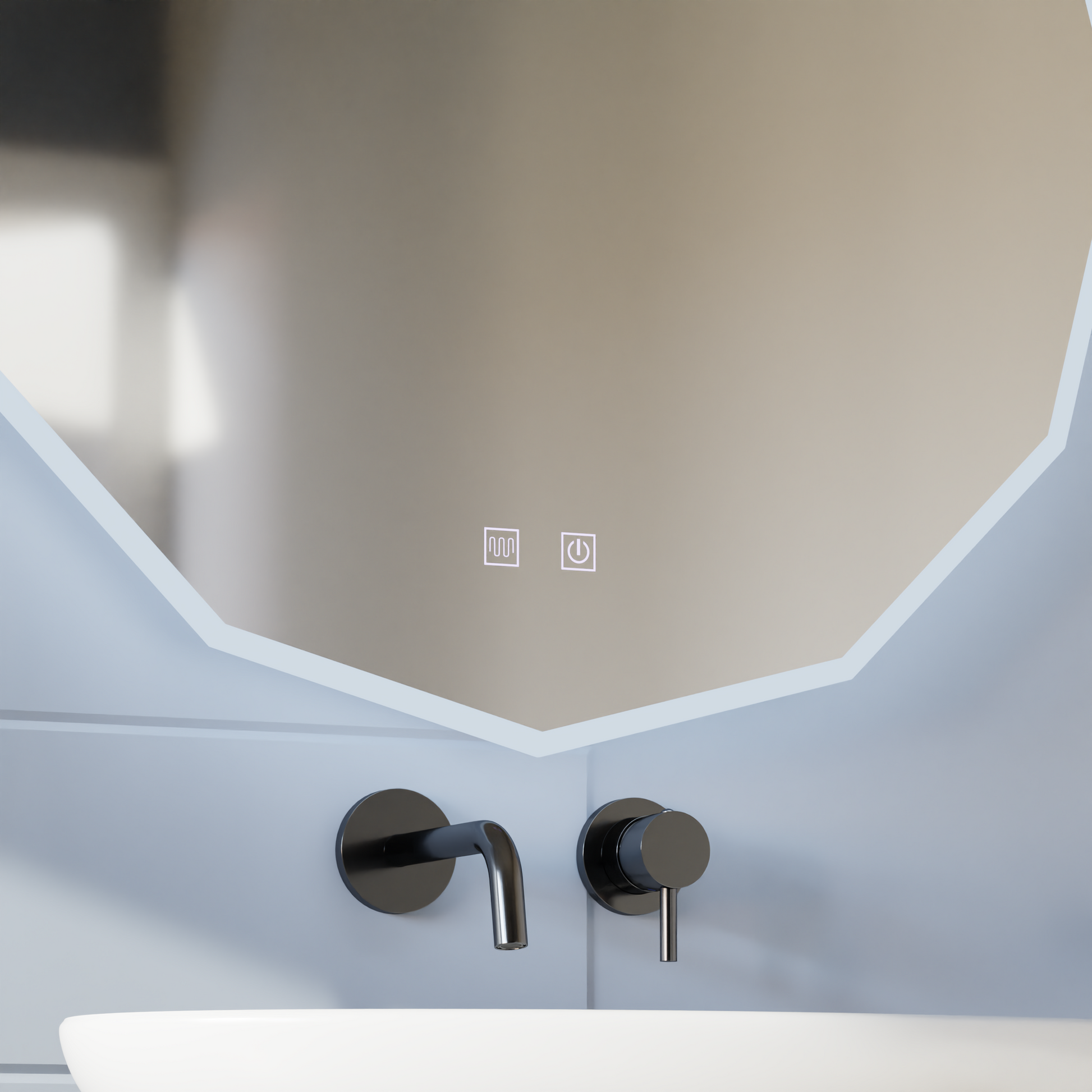 The 'Touch' control indicates that the light on/off and possibly other functions (such as light intensity, if dimmable) is achieved by touching a specific area on the mirror.