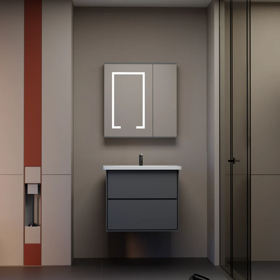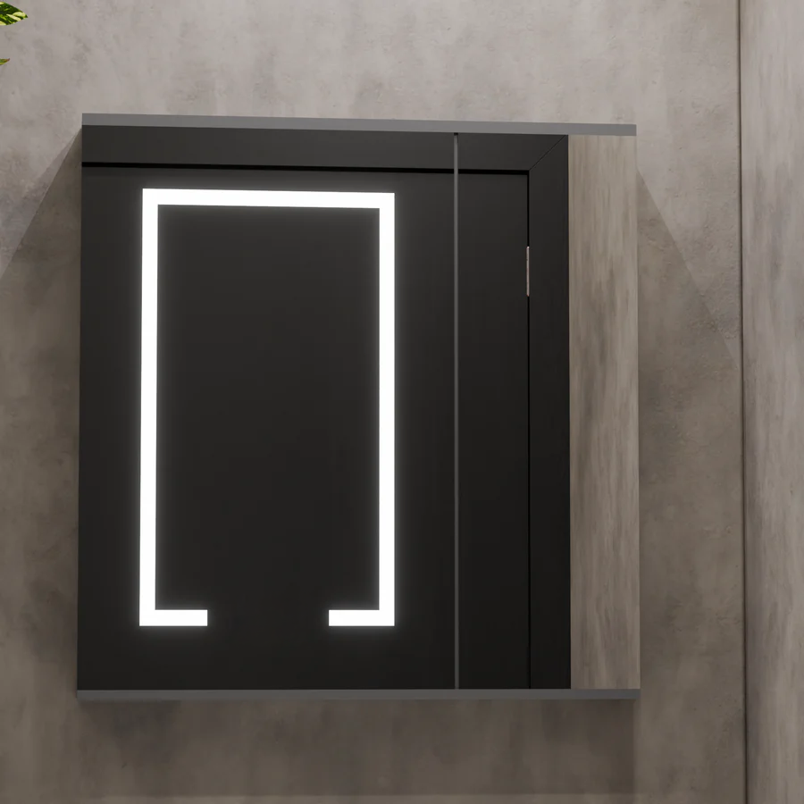 Upper Body (Furniture with LED Mirror) (60X50X53): This is a hanging cabinet that includes a mirror on the front. The LED lighting system is integrated on the contour of the mirror and projects the light outside, contributing to the general ambience of the bathroom. Behind the mirror there is storage space for organizing cosmetics and hygiene products.