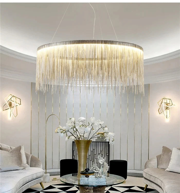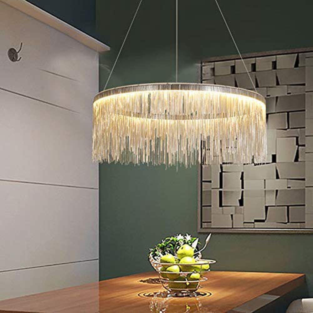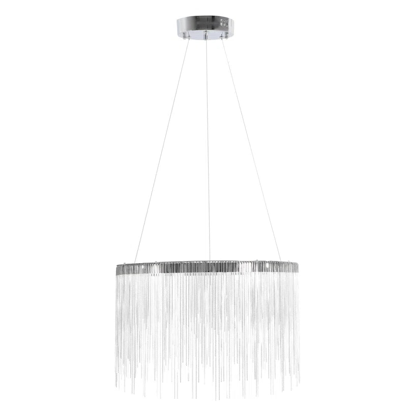 Suspended model, with diameter 49 cm and height 120 cm, recommended for dining room, living room or bedroom. Round construction, glossy chrome finish and lighting with integrated LED strip.